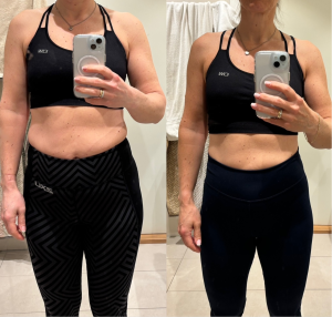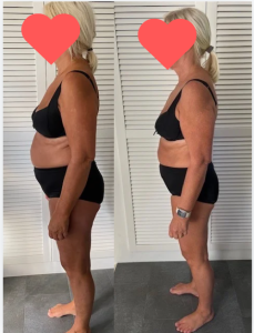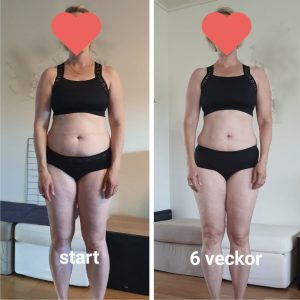 Mona: “Före/Efter!! 15 jan– 17 mars. Tänk att min putmage är borta och jag har armmuskler! Detta har blivit min nya livsstil, och jag mår så bra!”